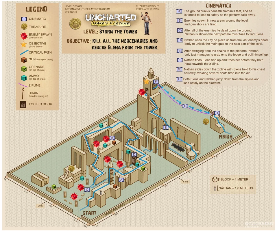 但LD们的Paper Design和MD甚至ND的Paper Design会有一些区别——首先你不用去把地图里每一个关卡元素都列出来,你应该强调的是你整体的任务动线,也就是玩家在这段流程里大致的行进路线。
