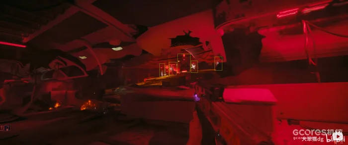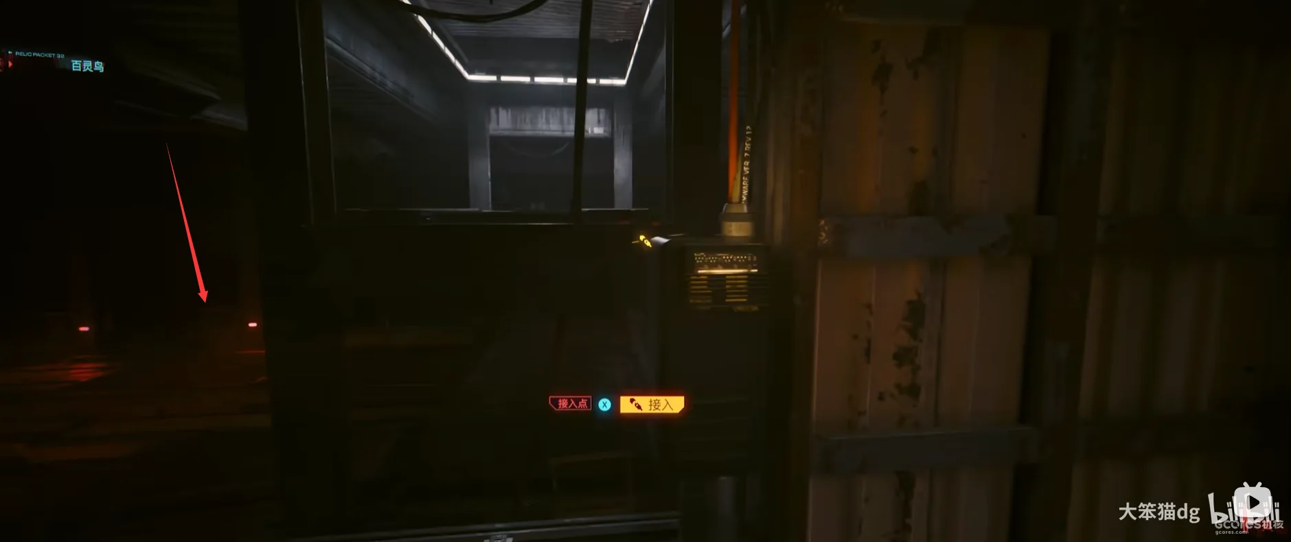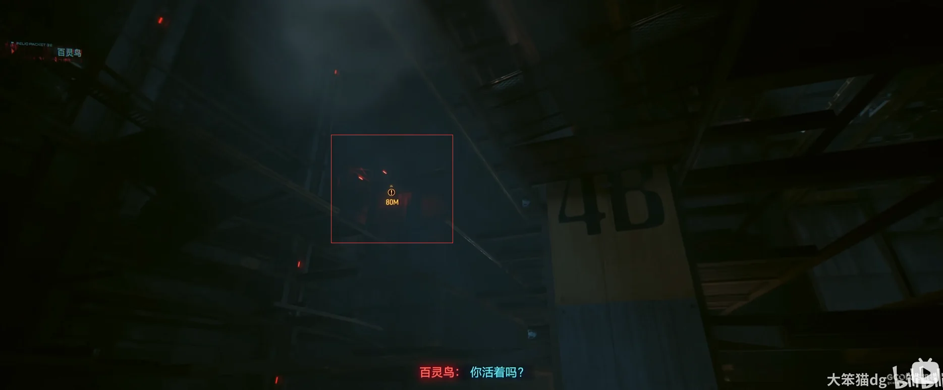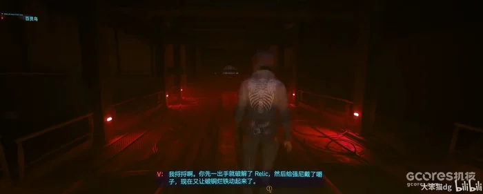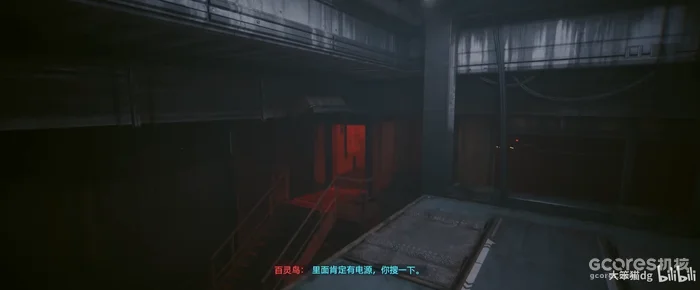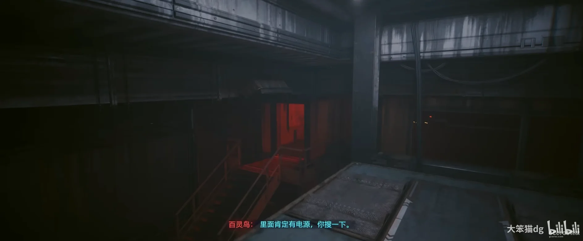 流程中,V不小心失足摔了一跤,镜头脚本看向高处,通往目的地的道路依旧是红色灯光来做指引。