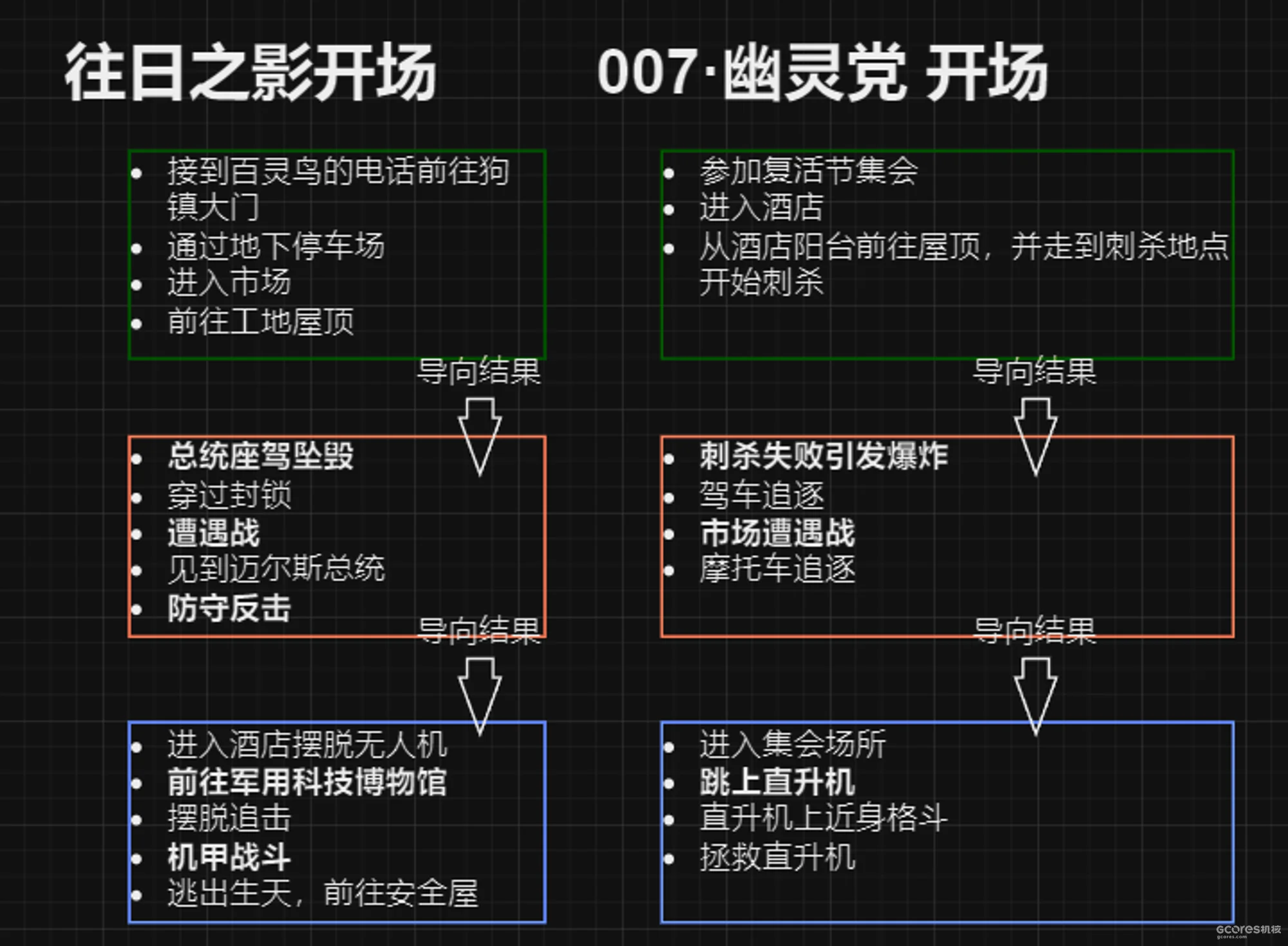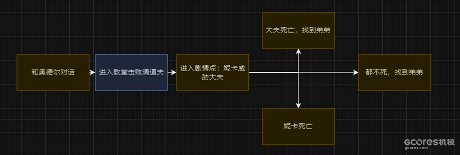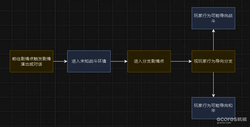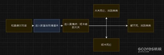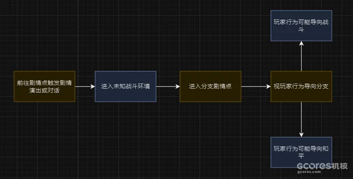 如果作为一个比较严苛的任务设计者,撇开在分支剧情点上提供给玩家选项并导向不同结果的设计。这个结构看起来是比较平白的。他需要Writer和Narrative在剧情点达成一个非常好的合作,思考如何将剧本拆分出任务驱动目的,角色目的,玩家可能存在的行为情境,并在后面的流程中做对应的体现。