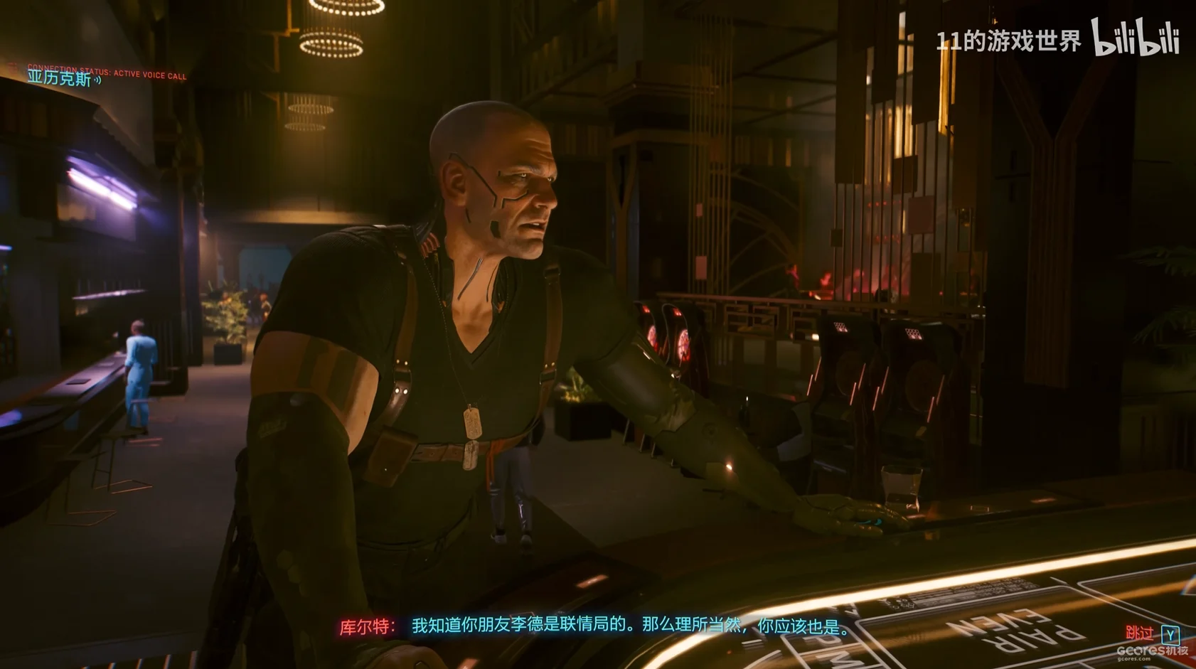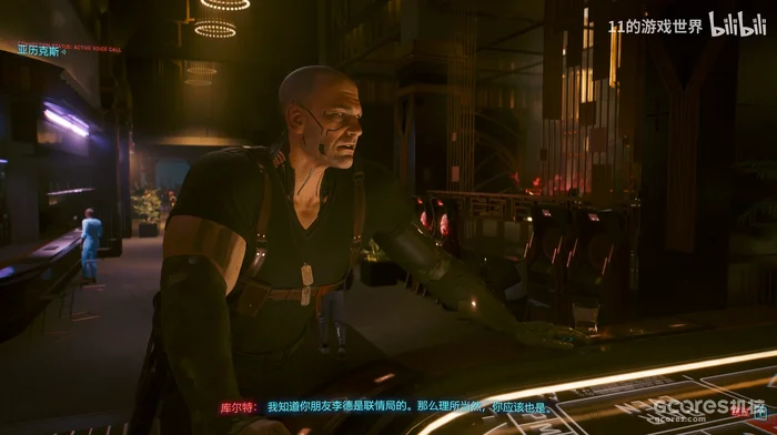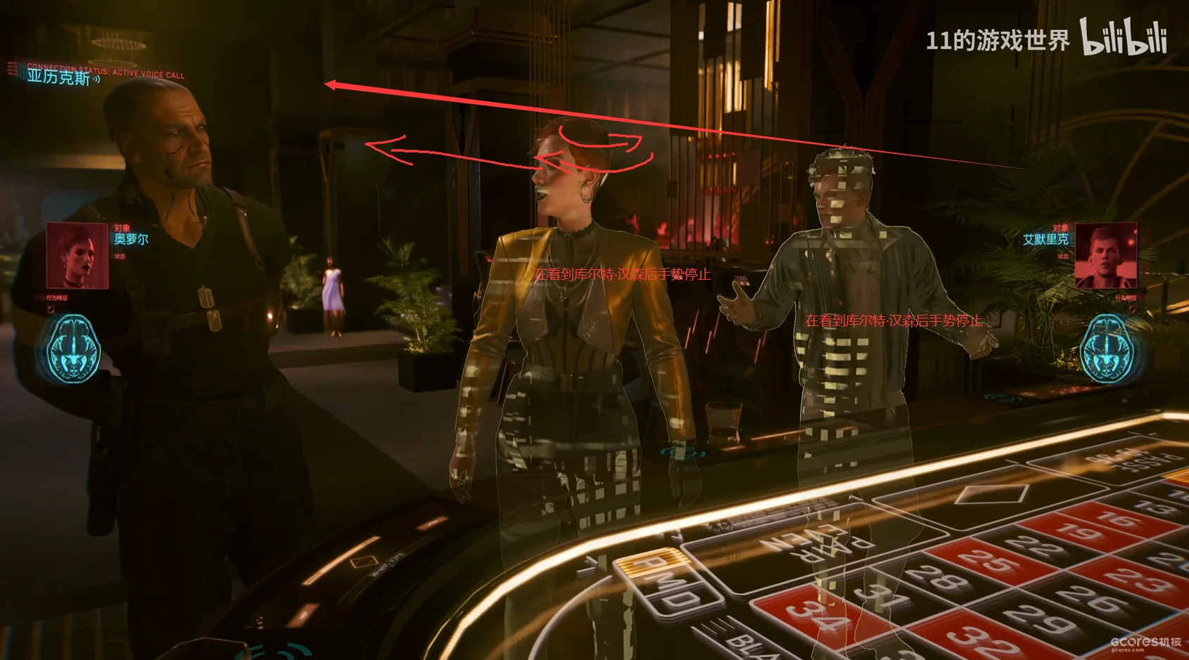而在玩家完成扫描时,库尔特·汉森从右侧进场,并在玩家画面左边位置停下,刚好是之前说那个给人感觉压迫感的NPC所在的位置。此时两个黑客的动作和表情都发生了变化,二者的微表情体现出了情绪被压制的感觉。