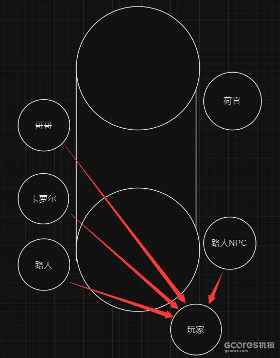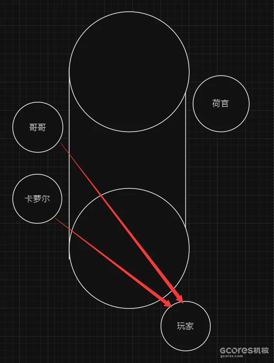 我们可以先来看一下这场轮盘赌的站位。玩家的处于桌子的右下角,路人,卡萝尔,弟弟位于玩家的左侧。在玩家的画面纵深关系内,玩家视角里很容易出现三个NPC的形象。其中卡萝尔位于视点中心,路人位于玩家视角左侧的侵入位置,哥哥位于右侧透视点位置。