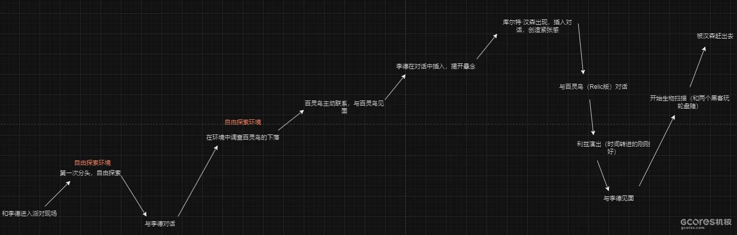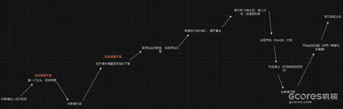 从流程上来看,本应该用于降低情绪和强度的对话因特殊角色加入引发的特殊事件,导致情绪上升,反而使得这段流程在未出现战斗或挑战的情况下紧张了起来。